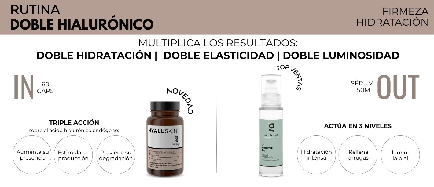 Rutina Doble Hialurónico (IN&OUT): Sérum Gel Hyaluronic 40% + Hyaluskin oral para doble hidratación, elasticidad y luminosidad. Piel más cómoda y con líneas finas suavizadas